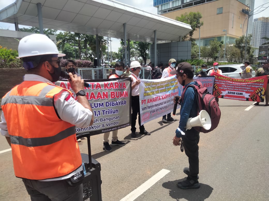 Sejumlah perwakilan dari beberapa vendor perusahaan termasuk mandor terlihat membentangkan sejumlah spanduk dan meneriakkan yel yel agar PT. Amarta Karya membayar hutang dan tagihan mereka.