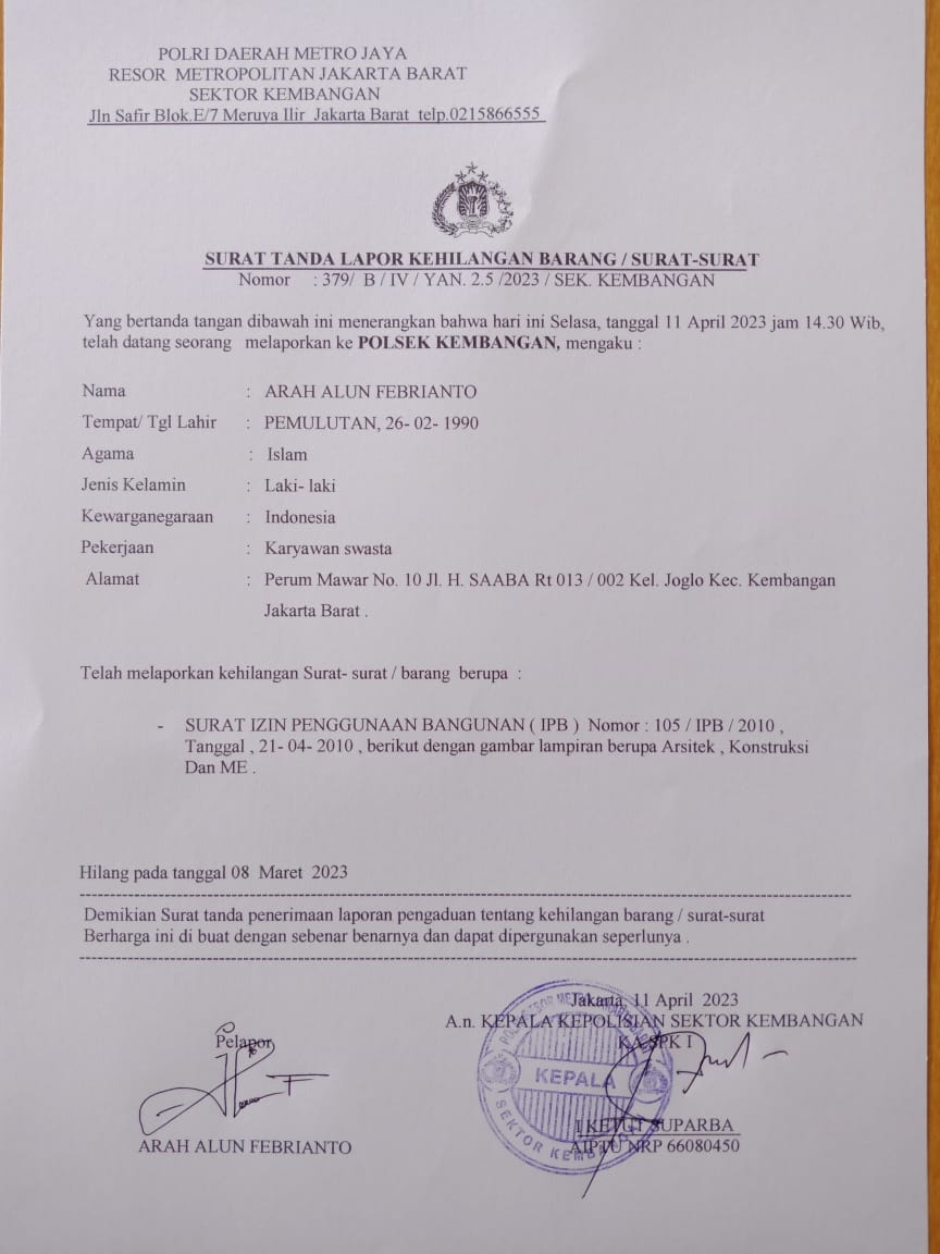 Kehilangan tersebut sudah dilaporkan ke Polsek Kembangan, Jakarta, 11 – April – 2023 oleh Arah Alun Febrianto dengan alamat Perum Mawar No. 10, Jl. H. Saaba RT 013/RW 002, Kelurahan Joglo, Kecamatan Kembangan, Jakarta Barat.