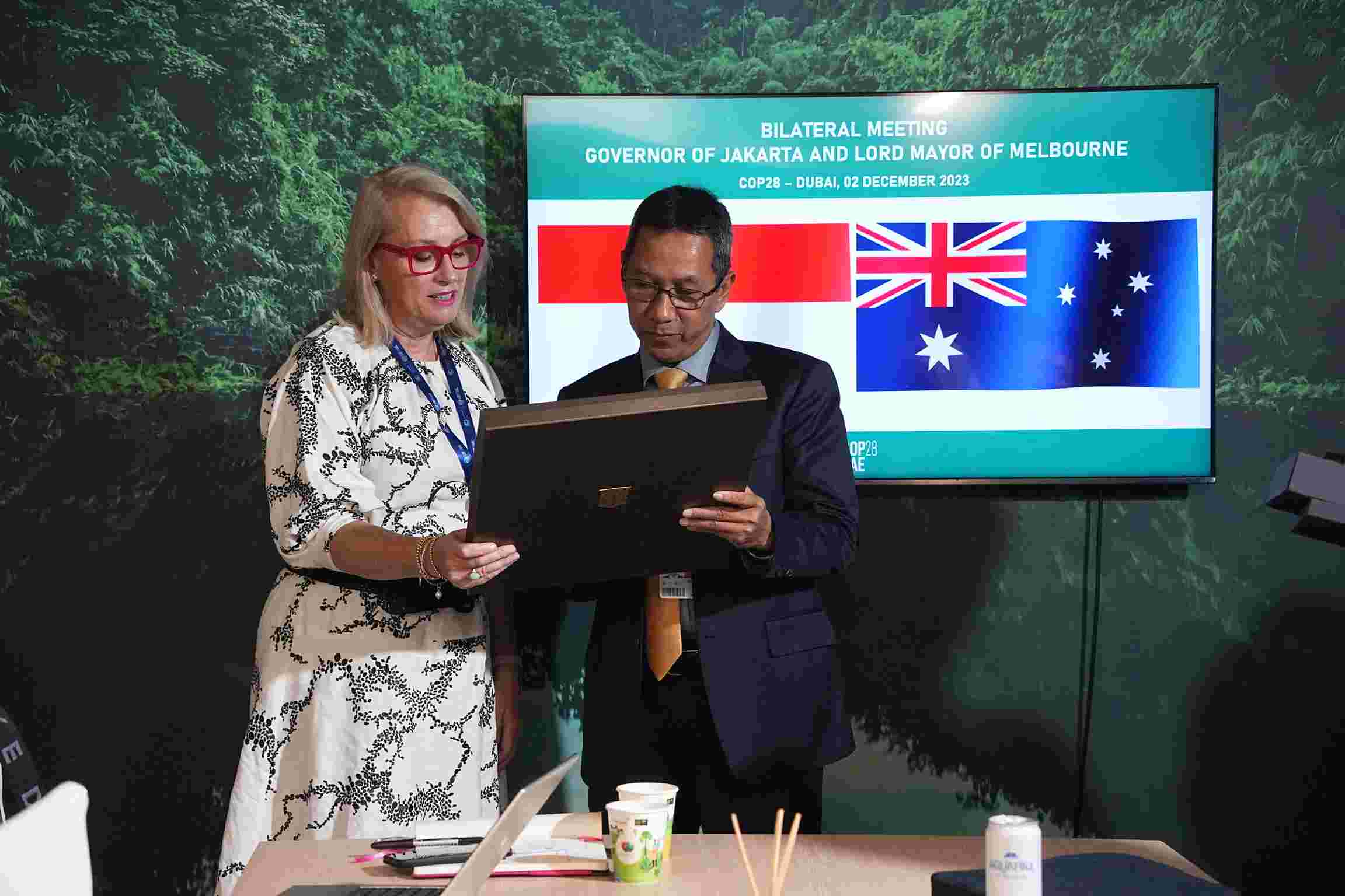 DUBAI, JAKARTAPEDIA.co.id – Penjabat (Pj.) Gubernur Daerah Khusus Ibukota Jakarta, Heru Budi Hartono dan Walikota Melbourne, Sally Capp lakukan pertemuan bilateral untuk menjajaki rencana kerja sama Jakarta-Melbourne, pada Sabtu (2/12/2023). Pertemuan ini diselenggarakan di sela-sela agenda kedua pemimpin kota dalam Konferensi Tingkat Tinggi Perubahan Iklim – COP 28 di Dubai, Persatuan Emirat Arab (UEA).