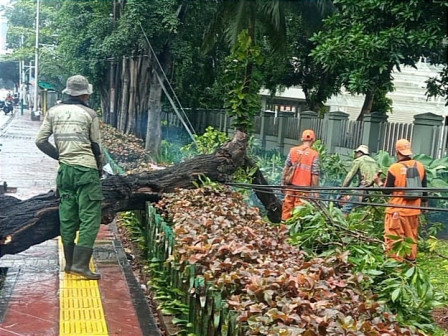 “Pohon tumbang ke arah trotoar dan taman, serta menimpa kabel udara yang ada di sekitarnya,” ujarnya, Sabtu (27/1/2024).