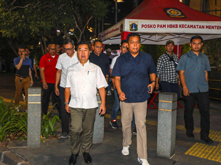 Pj Gubernur Teguh dan jajaran Pemprov DKI Jakarta meninjau panggung hiburan pertama yang terletak di depan Hotel Mandarin Oriental, Bundaran HI, dengan berjalan kaki.