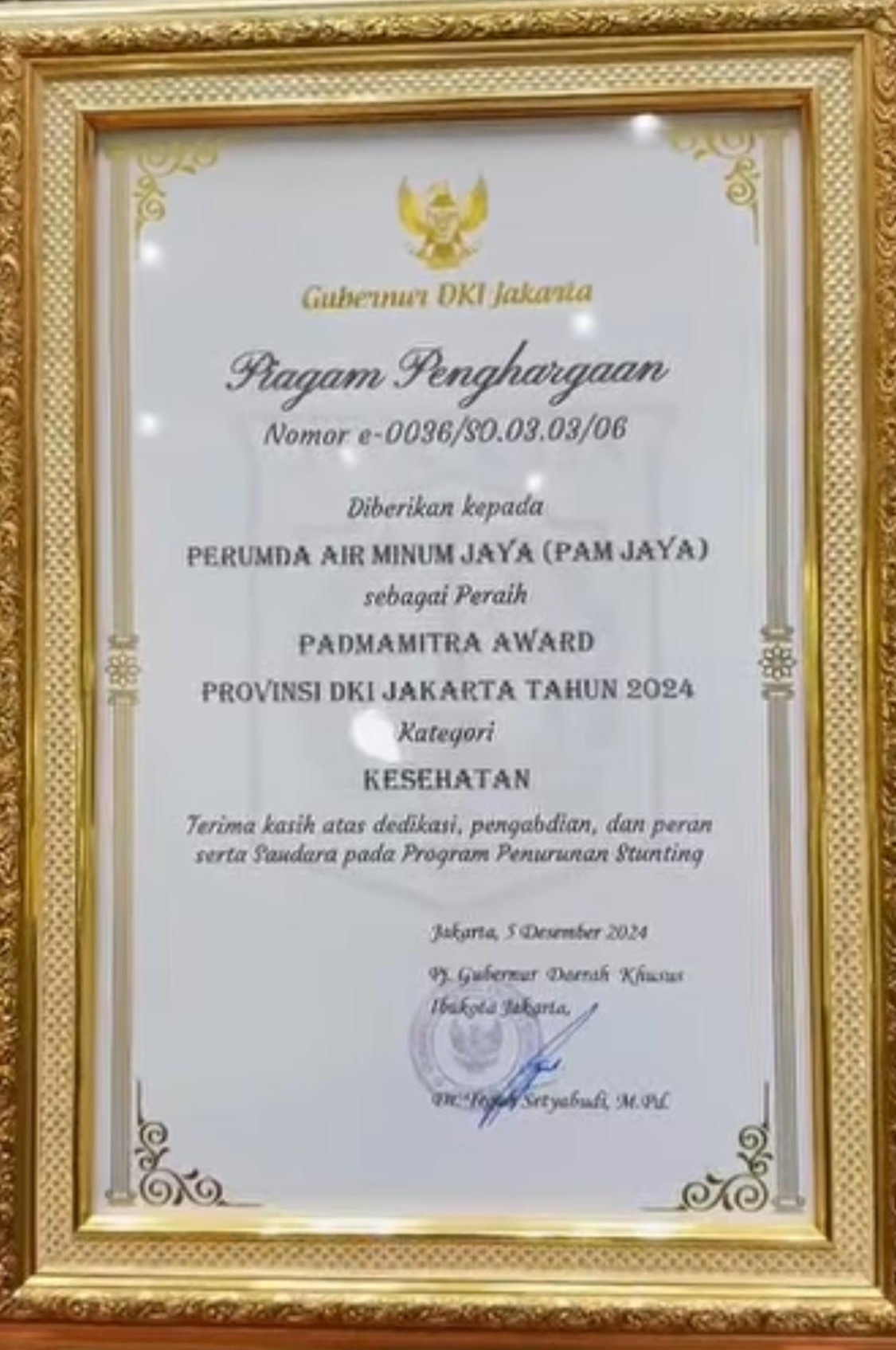 Direktur Pelayanan PAM Jaya, Syahrul Hasan, menyampaikan rasa syukur atas penghargaan yang diterima. “Alhamdulillah, hari ini kami mendapatkan apresiasi dari Padmamitra Award. Kami berharap penghargaan ini menjadi semangat untuk terus berbuat lebih baik bagi warga Jakarta, khususnya dalam menanggulangi stunting,” ujar Syahrul, yang menerima penghargaan secara langsung dari Penjabat (PJ) Gubernur DKI Jakarta, Teguh Setyabudi dan disaksikan oleh Wakil Menteri Sosial Republik Indonesia, Agus Jabo Priyono,