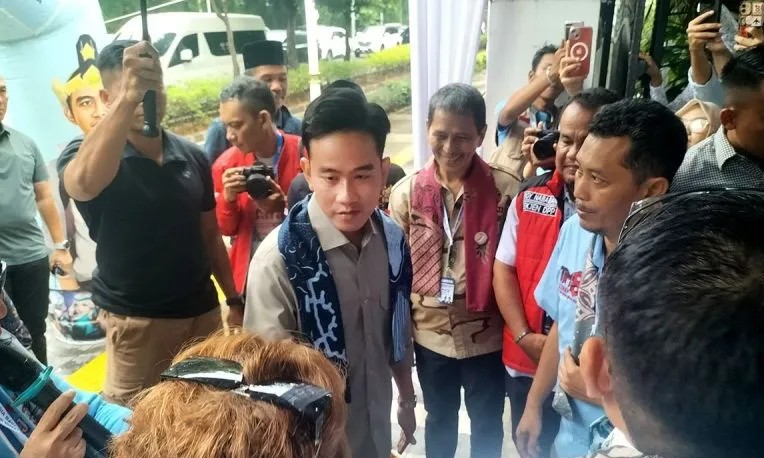 Dalam pantauan di lokasi, Gibran yang memakai baju berwarna coklat lengan panjang dan celana panjang berwarna hitam turun dari kendaraannya diiringi oleh jajaran pasukan pengawal presiden (Paspampres) di depan para relawan.