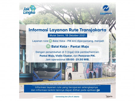 JAKARTAPEDIA.id – PT Transportasi Jakarta (Transjakarta) melakukan perluasan layanan pada rute PIK-Balai Kota (1A) menjadi Balai Kota-Pantai Maju mulai hari ini Senin (18/10/2021).