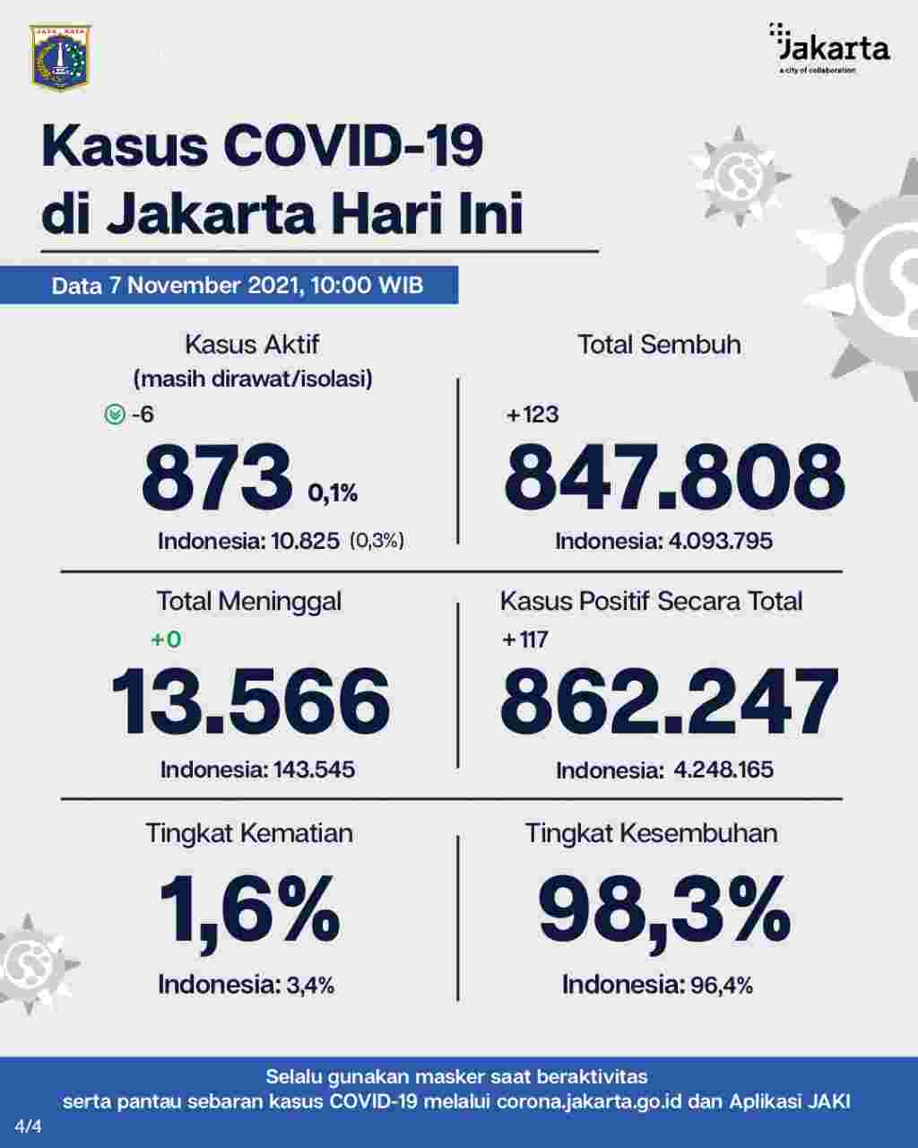 Adapun jumlah kasus aktif di Jakarta turun sejumlah 6 kasus, sehingga jumlah kasus aktif sampai hari ini sebanyak 873 (orang yang masih dirawat/ isolasi).