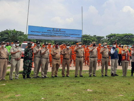 Wali Kota Jakarta Selatan, Munjirin, memimpin apel kesiapsiagaan menghadapi penghujan di Lapangan Waduk RW 01, Kelurahan Pesanggrahan, Jakarta Selatan, Selasa (9/11/2021).