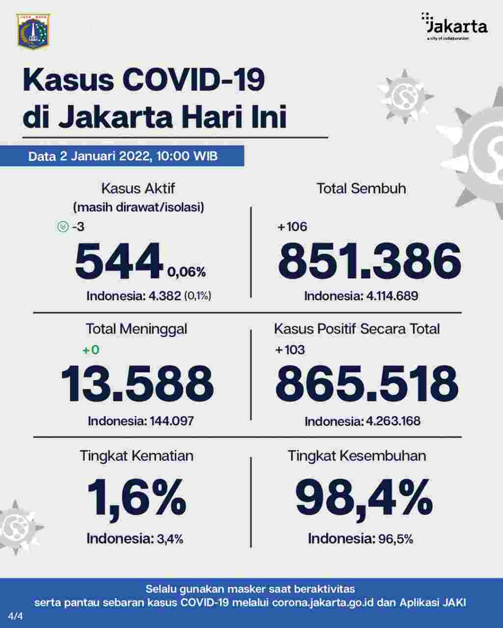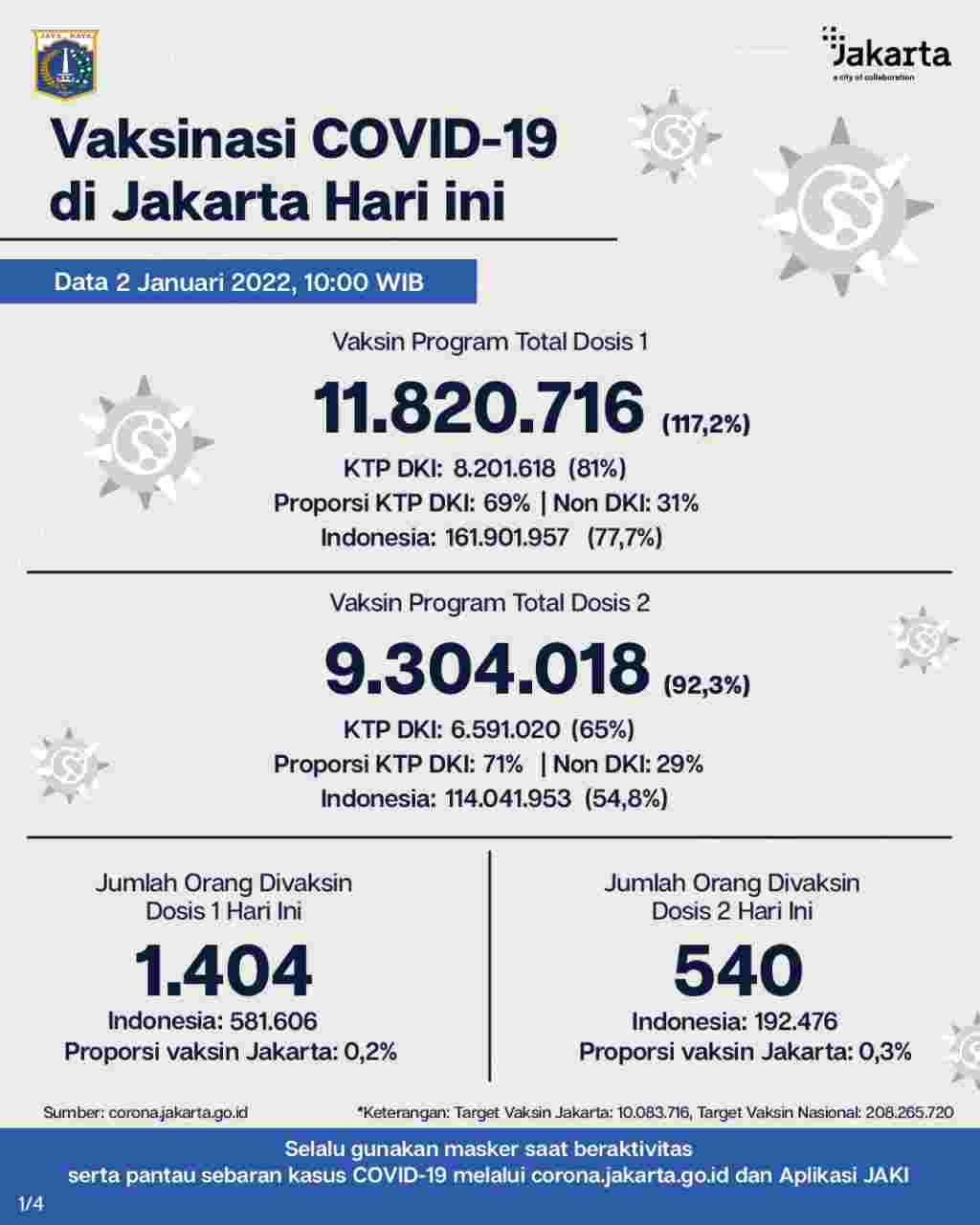 Pemprov DKI Masih Terus Kendalikan Pandemi Covid 19, Berikut Perkembangan Data Kasus & Vaksin per 2 Januari 2022