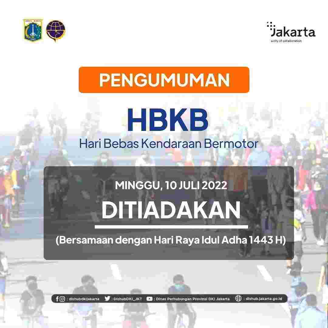 JAKARTAPEDIA.co.id – Pemprov DKI Jakarta meniadakan kegiatan Hari Bebas Kendaraan Bermotor (HBKB) yang bertepatan dengan perayaan Hari Raya Iduladha 1443 H pada hari Minggu, 10 Juli 2022. Hal ini disampaikan Kepala Dinas Perhubungan DKI Jakarta, Syafrin Liputo, di Balai Kota Jakarta, Kamis (7/7/2022).