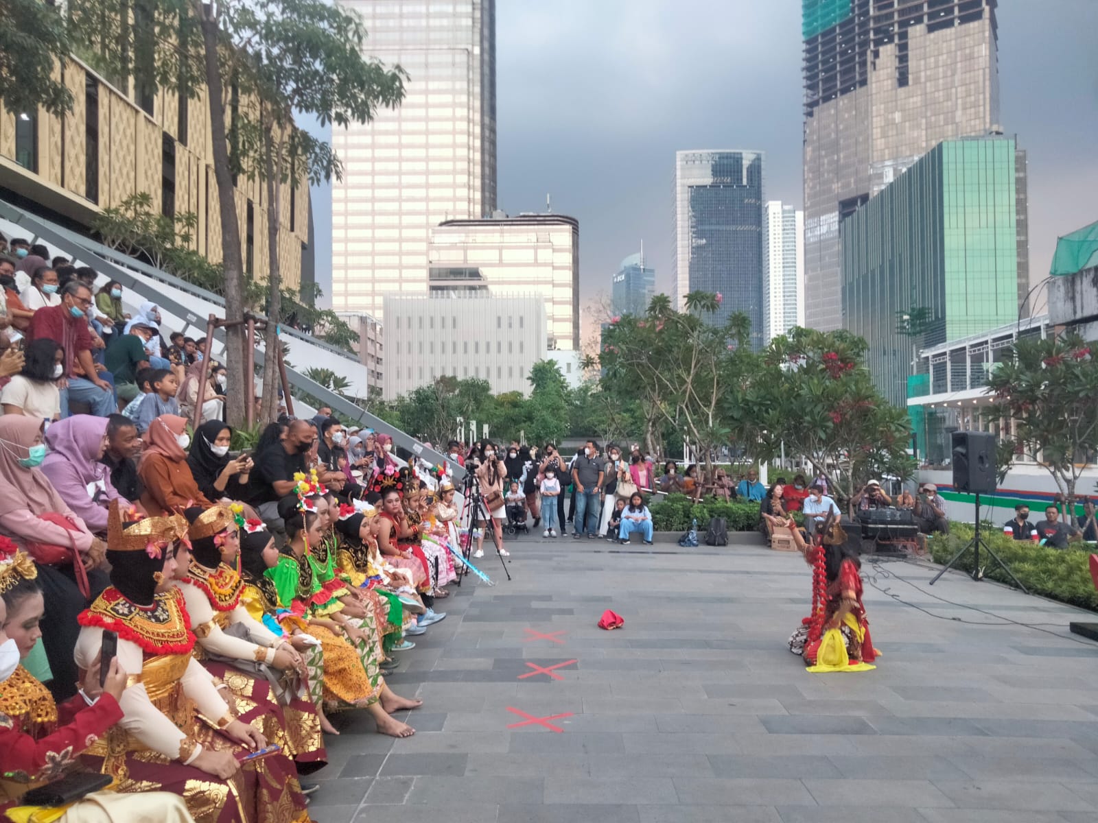 JAKARTAPEDIA.co.id – Ratusan pengunjung Sarinah Thamrin Jakarta memadati tempat duduk di Anjungan Budaya sisi barat pada Sabtu (22/10/2022) mulai pukul 15.30 WIB hingga 17.30 WIB, untuk menyaksikan penampilan para penari tradisional dari Kota Bekasi, Sanggar Indra Kusuma.