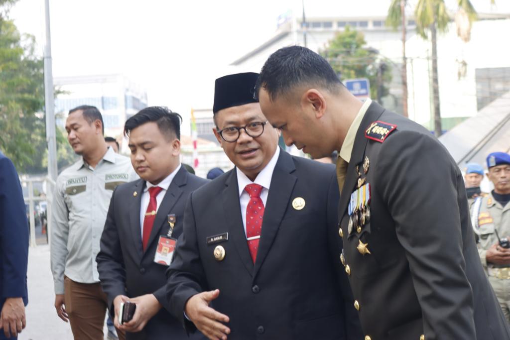 Pj Wali Kota Bekasi R Gani Muhamad disambut langsung oleh Dandim 0507/Bekasi Kolonel Arm Rico Ricardo Sirait dan para Unsur Forum Koordinasi Pimpinan Daerah (FORKOPIMDA) yang hadir pada Upacara Peringatan HUT TNI ke-78 Tahun 2023.