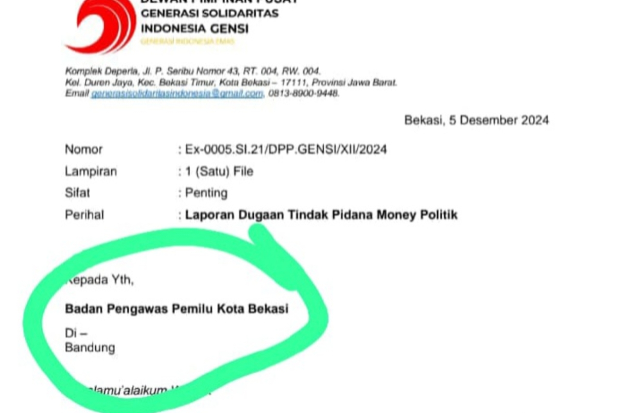JAKARTAPEDIA.co.id| BEKASI – Surat yang berisi dugaan money politik yang dibuat dengan menggunakan kop surat Dewan Pimpinan Pusat Generasi Solidaritas Indonesia Gensi dengan alamat kantor di wilayah Kelurahan Duren Jaya Kecamatan Bekasi Timur tertanggal 5 Desember 2024, beredar di kalangan sejumlah awak media.