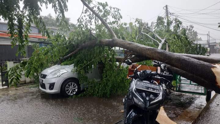 Hujan Deras di Kota Bekasi, Pohon Tumbang Menimpa Dua Kendaraan di Mustika Jaya